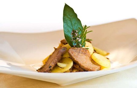 Das Öl und die restliche Butter (30 g) in einer Pfanne erhitzen. Das geschnittene Rindfleisch darin anbraten und salzen. Anschließend das Fleisch und die Kartoffelscheiben vermischen. Die Kräuter (Majoran, Petersilie, Lorbeerblatt) dazugeben und mit Salz und Pfeffer würzen.