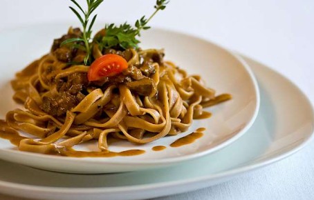 Die Kastanienbandnudeln in einer Pfanne mit dem Wildragout gut durchschwenken und anrichten.